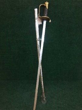 A military basket handled sword in scabbard