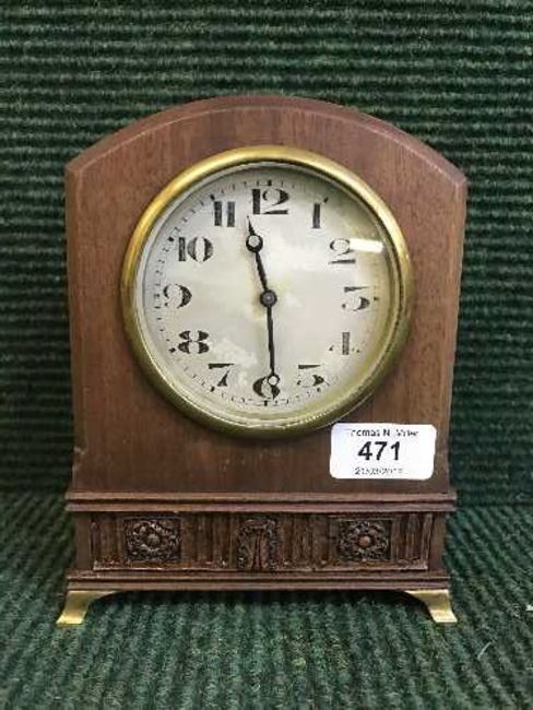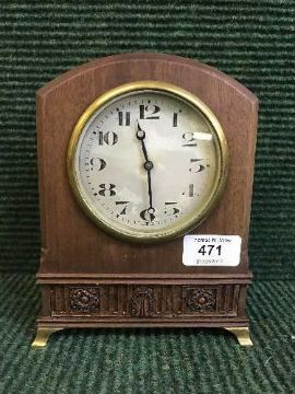 A mahogany mantel clock on brass bracket feet
