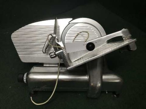 A stainless steel commercial meat slicer