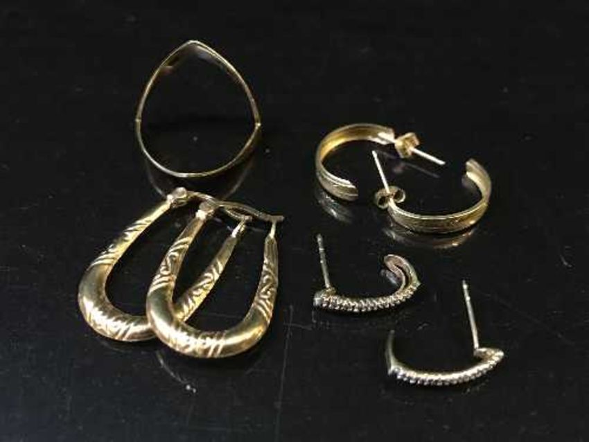 A 9ct gold ring, together with three pair of yellow metal earrings