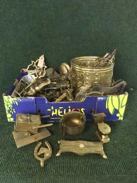 A box of brass coal bucket, companion sets, brass figures, bellows etc.