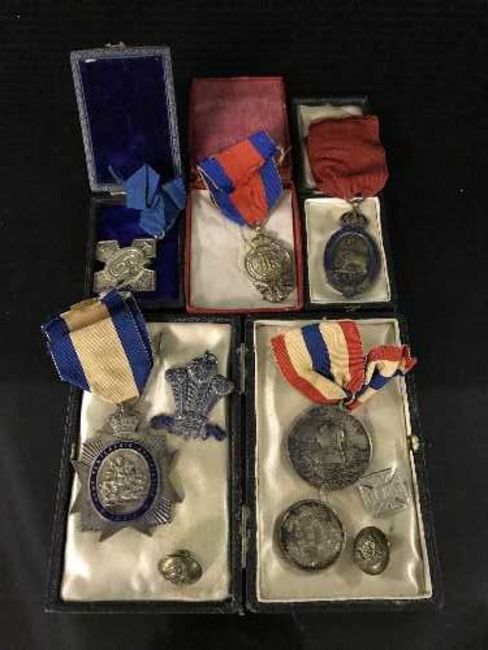 A box of five late nineteenth and early twentieth century Indian temperance medals, some parts silver together with a 1910 cricket coin
