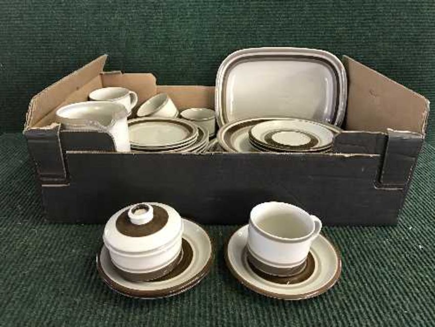 Two boxes of blue and white meat plates, Finish Arabia dinner service, delft china etc