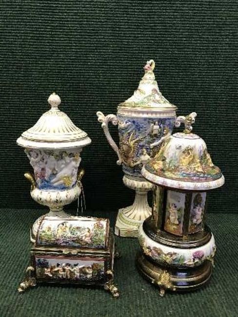 An Italian musical trinket box and cigarette holder, two Italian china lidded urns