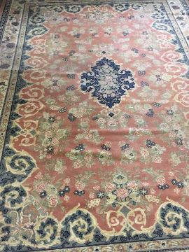 A large fringed floral carpet on salmon ground