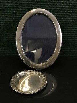A oval silver photograph frame together with a pin dish