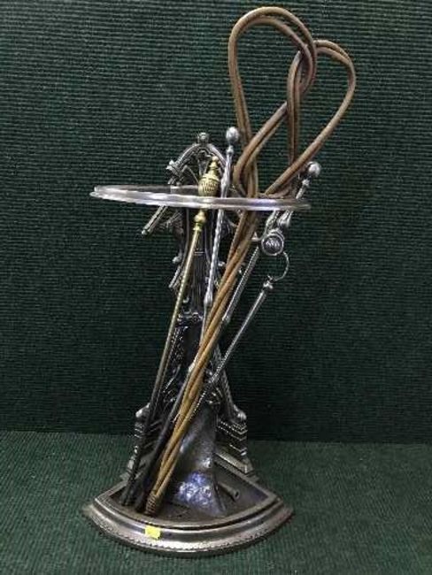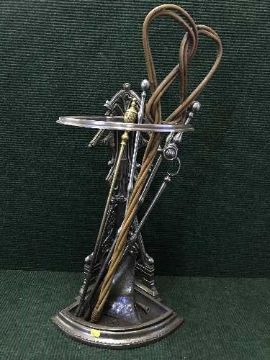 An early 20th century chrome corer stick stand with carpet beater and companion set