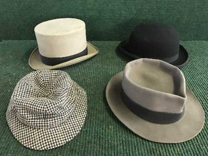 A basket of top hat, bowler hat, a trilby hat and one other