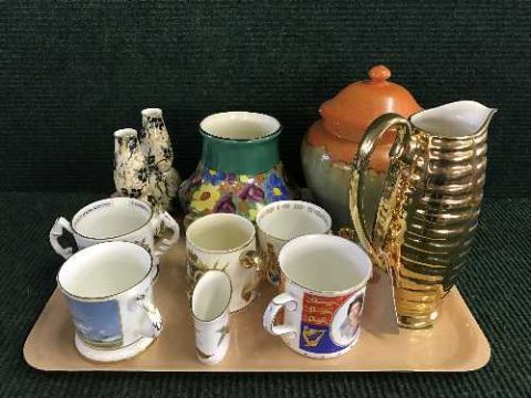 A tray of commemorative ware mug, Crown Devon jug, Crown Ducal vases, etc