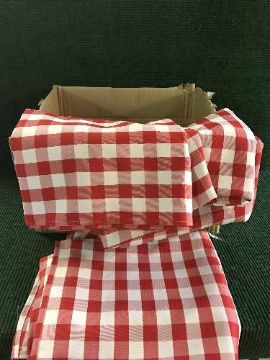 A box of red and white checkered table covers
