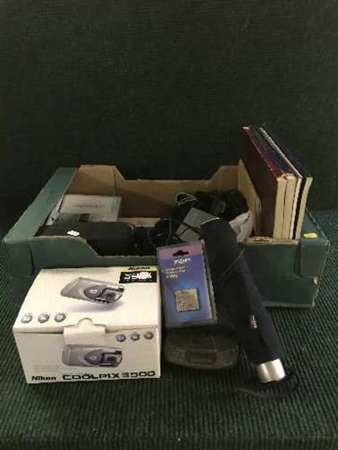 A box of digital cameras, binoculars, Technics discman, umbrellas, commemorative books etc