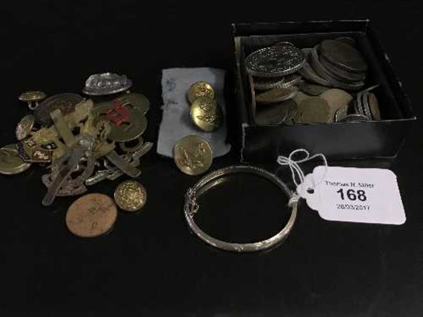 A collection of coins to include a George III penny, commemorative coins, silver bangle, military buttons, trench lighter etc
