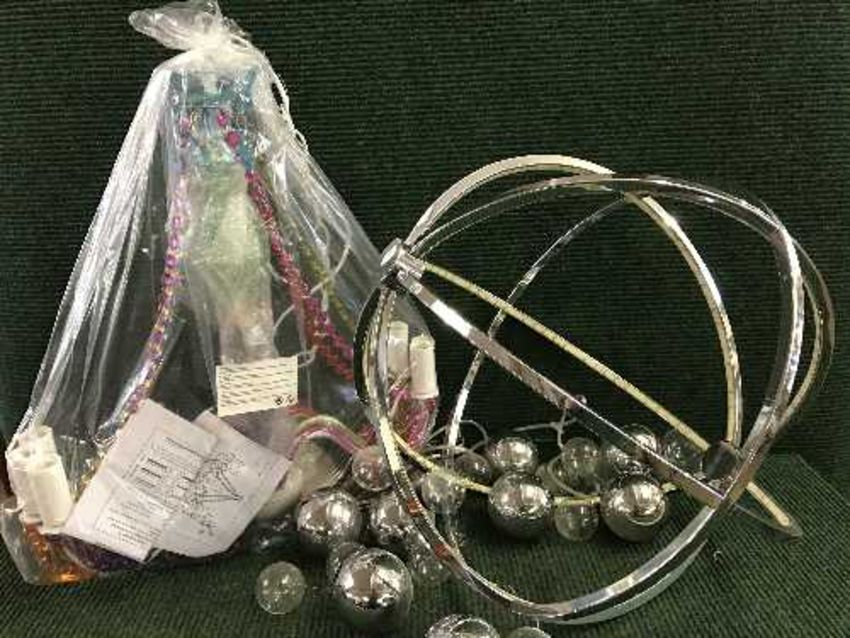 A decorative coloured glass light fitting together with two contemporary lights and three way light
