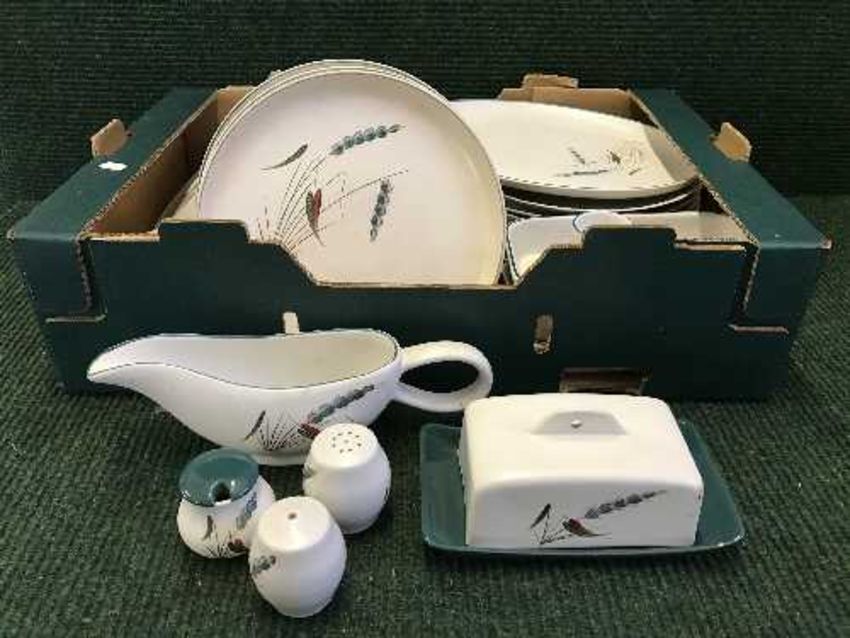 Two boxes of German tea and dinner service, part Denby Green Wheat dinner ware.