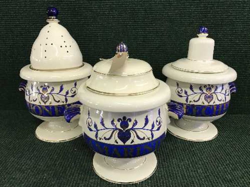 Three pottery lidded Chemist's dispensers (two with lids) - Olivar.provence, Scorpions and Syrup Tanarin Dorum