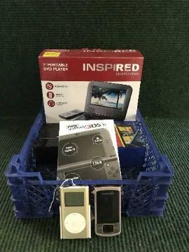 A basket of portable dvd player, Ninetndo 3DS XL, mobile phones, pet tracker etc