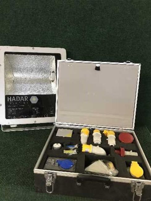 An industrial site light, halogen spot light and an aluminium case of accessories