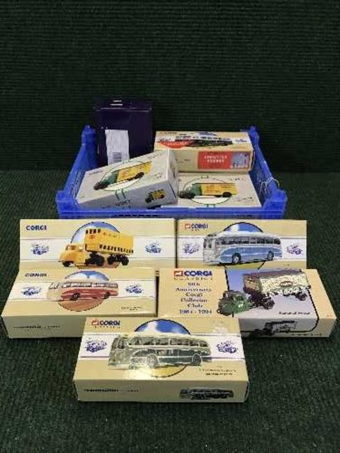 Five Corgi Classic busses together with two Corgi NSPC vehicles and three other vehicles, all parts boxed. (10)