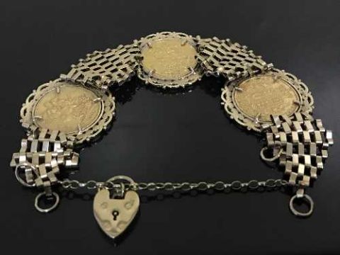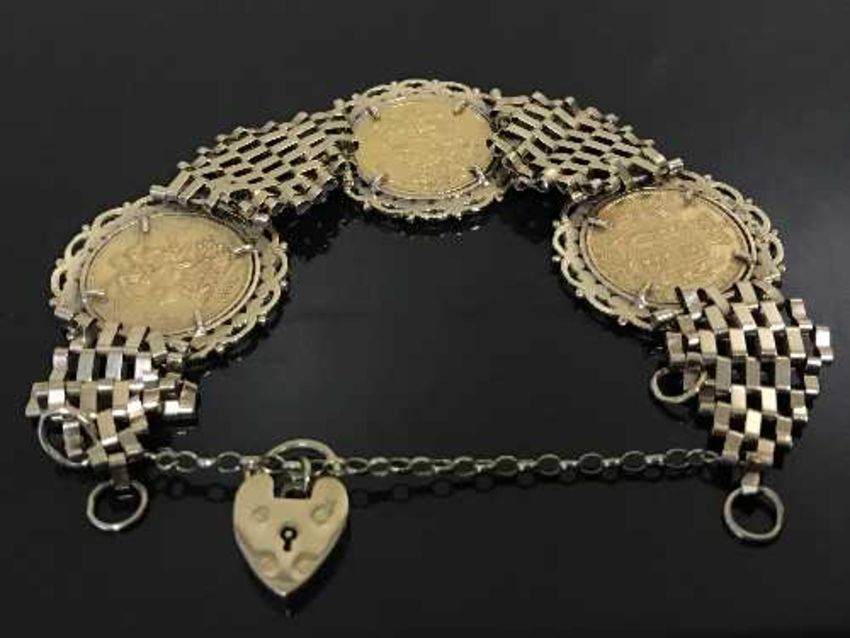 A 9ct gold gate bracelet, each panel inset with three full Young Head Victoria Sovereigns dated 1872, 1876 and 1878, gross 52.8g.