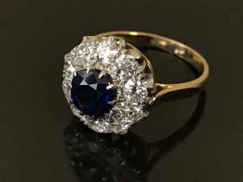 A sapphire and diamond cluster ring, the sapphire weighing an estimated 1.50 carat, the diamonds an estimated 1.40 carat, on yellow gold shank, 4.0g
