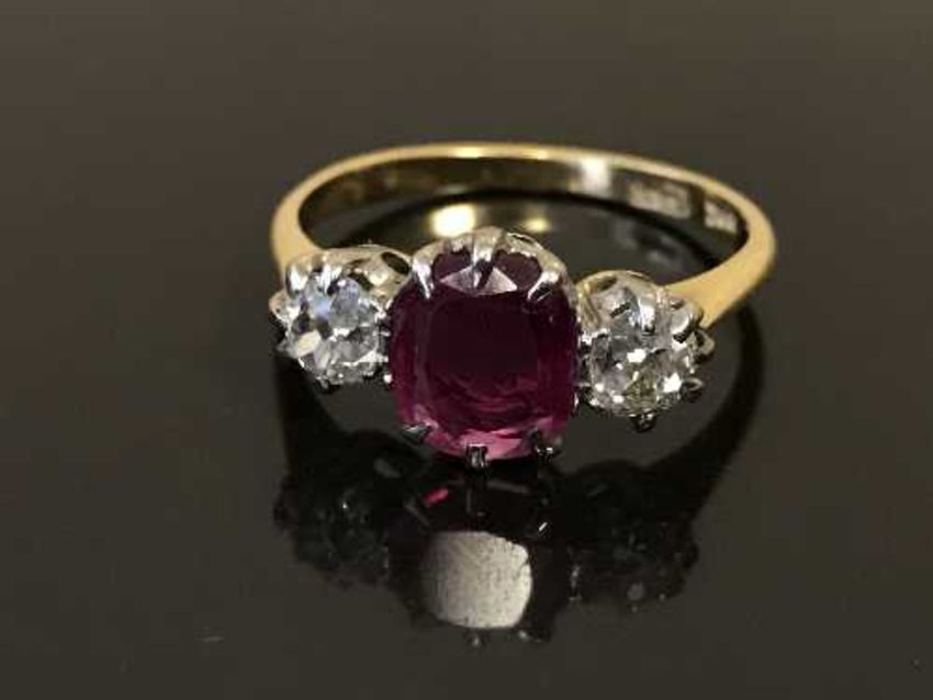 An antique 18ct gold ruby and diamond set ring, accompanied by a diamond grading report stating the ruby to weigh 1.05 carat, the diamonds having a weight of 0.66 carat, colour G, clarity VS1