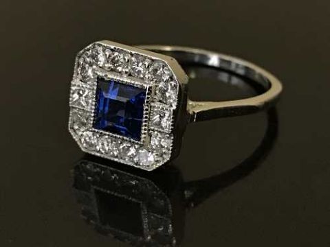 A sapphire and diamond set cluster ring, the sapphire etsimated to weigh 0.72 carat, the diamonds 0.42 carat, 3.6g