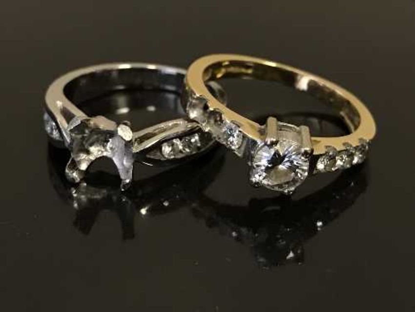 An 18ct gold and diamond set ring, with diamond set shoulders, together with a platinum ring with diamond set shoulders (no stone mounted in centre) 9.0g gross