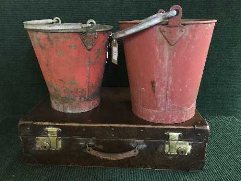 Two metal fire buckets and a vintage luggage case