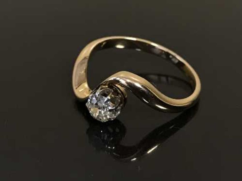 A diamond solitaire ring on yellow metal shank