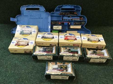 A tray of five boxed Corgi trams, four Eddie Stobbart vehicles and a Thomas the Tank Engine case containing die-cast trains