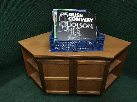 A Nathan teak corner tv stand together with a crate of assorted lps including compilations, musicals etc.