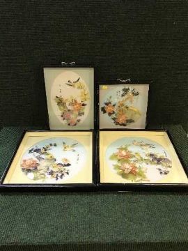 A set of four framed Oriental collages depicting birds
