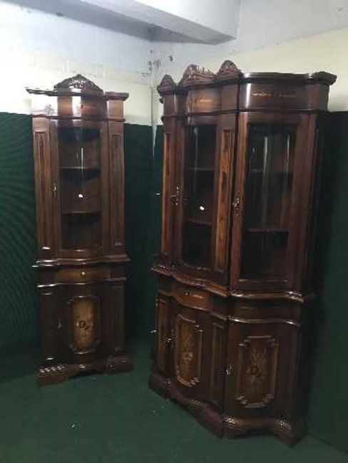 An Italian style triple door display cabinet together with matching corner display cabinet
