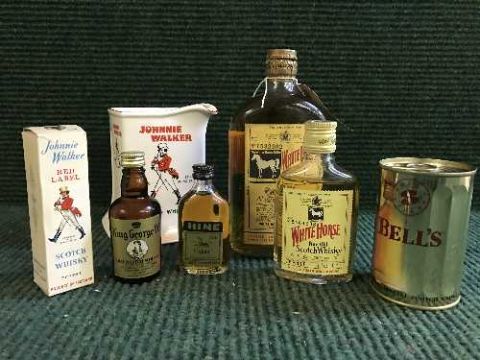 A bottle of White Horse Scotch Whisky, numbered 1599902, together with a sealed can of Bells Extra Special Scotch, White Horse 70% proof 9.4cl, Hine Cognac 70% proof, King George IV Scotch Whisky, Johnnie Walker Red Label and a Johnnie Walker Whisky jug. (7)