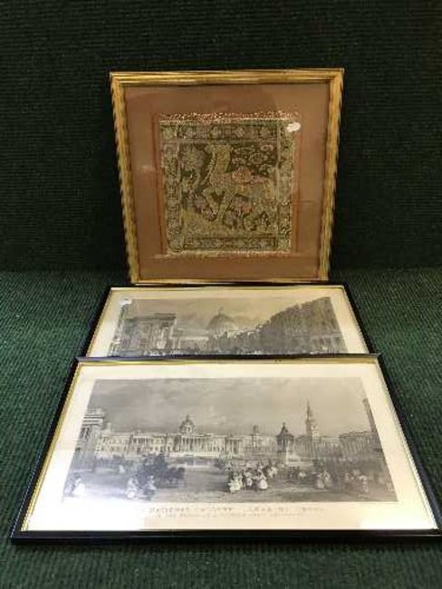 A box of gilt framed needlework depicting a camel, a pair of black and white engravings depicting scenes of London by Allan, black and white prints depicting North Shields in the 1830's etc.