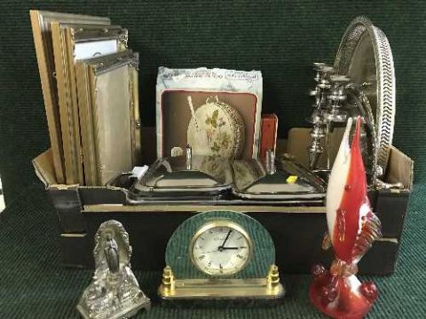 Two boxes of champagne flutes, continental china tea service, table lamp, wooden galleons, plated pieces, serving dish, picture frames etc.