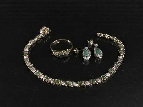 A 9ct gold emerald and diamond bracelet together with pair of earrings and matching dress ring. (4)