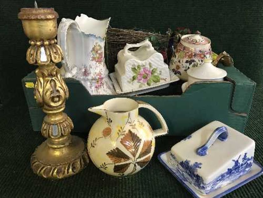 A box of early twentieth century pottery including toilet jug, cheese dish and covers, English teapot, Sylvac caddy etc