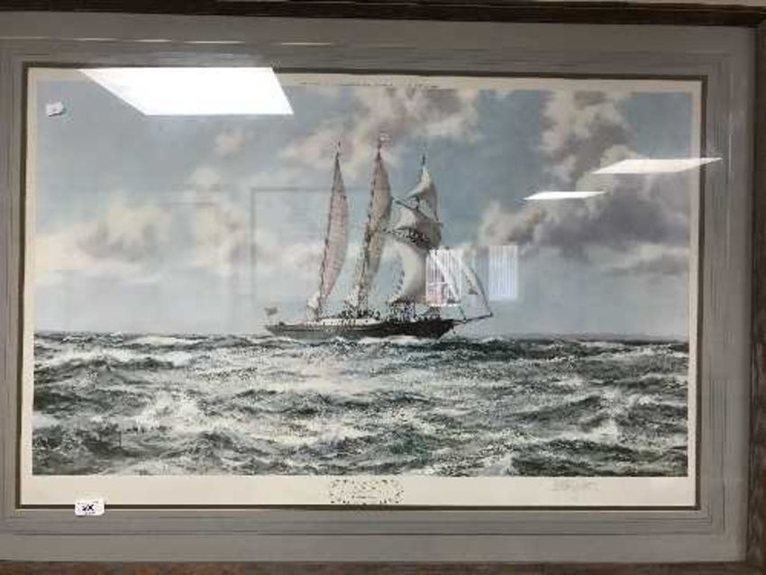 After Montague Dawson : In Full Sail, reproduction in colours, signed in pencil, with the blindstamp of The Fine Art Trade Guild, published by Venture Prints Limited, 1972, 54 cm x 91 cm, framed.