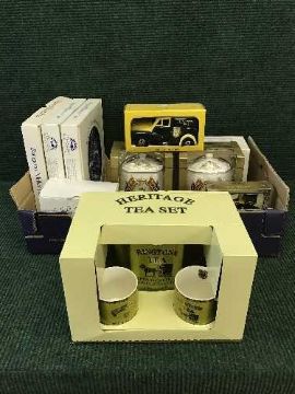 A box of Ringtons china - Heritage tea set, Millennium plates, two caddies, Morris Minor van etc