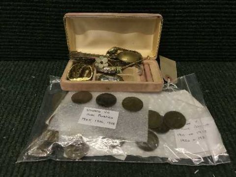 A box of crested spoon, plated pickle fork, lady's brooch, four wrist watches and a bag of late 19th and early 20th century British coins - Edward VII pennies, Queen Victoria model half sovereign etc