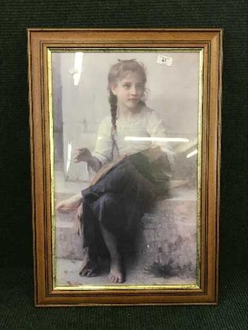 A set of three mahogany contemporary prints including The Picture Girl, The you Seamstress by William Adolphe Bouguereau, two wall canvases and one other picture