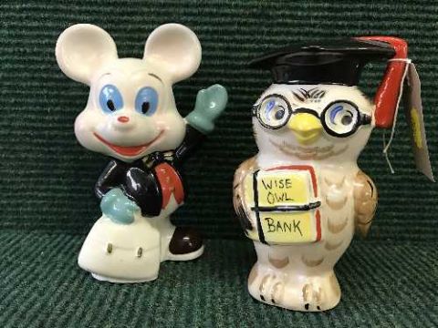 A mid 20th century pottery money box "wise owl" and a Chinese money box of a mouse