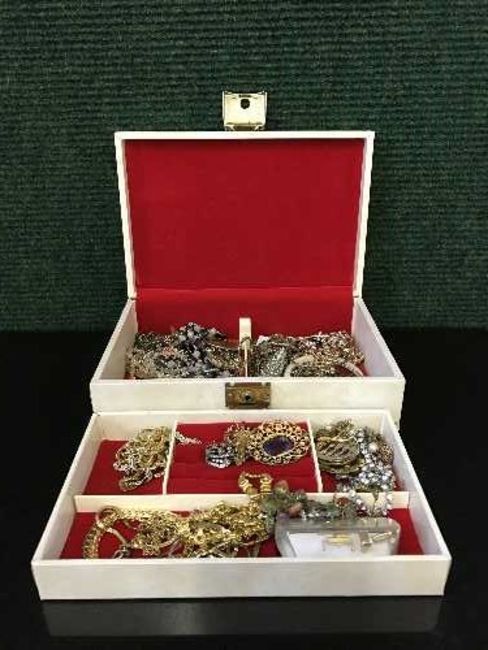 A box of beaded chains, costume jewellery and two napkin rings