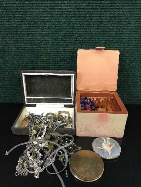 Two jewellery boxes containing compacts, brooches, costume jewellery etc