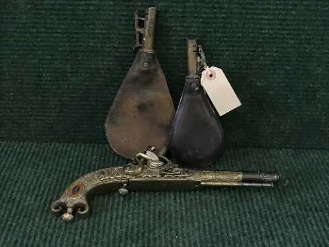 Two antique leather shot-flasks together with an ornamental flintlock pistol