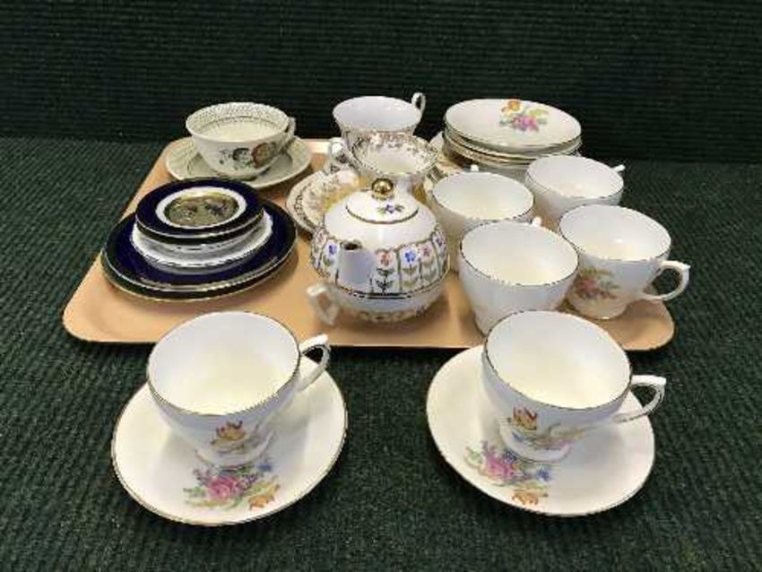 A tray of bone china tea set, Masons cup and saucer, Crown porcelain plate etc