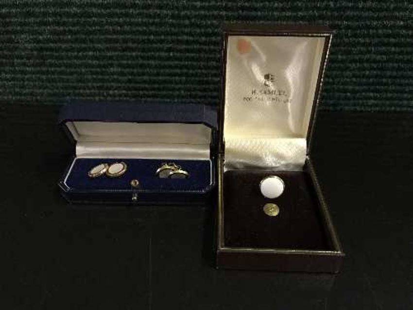 A pair of 18ct gold, enamel and mother of pearl cufflinks, together with a collar stud