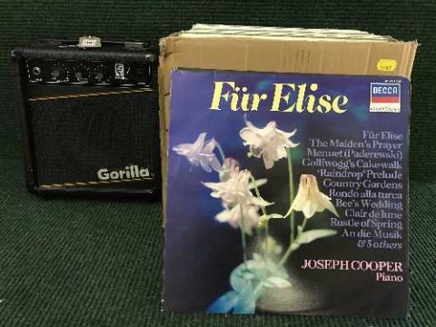 A Gorilla mini guitar amp, two projectors, LP classical records and a case of 45s