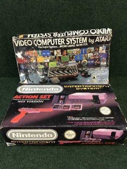 A boxed Nintendo entertainment system with games together with an Atari video computer system